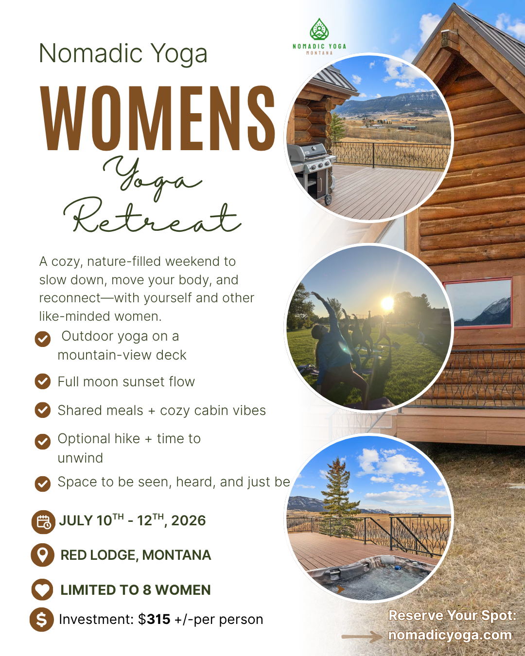 We’ll be staying at a beautiful cabin surrounded by Montana landscape, complete with an outdoor deck for yoga, a hot tub for soaking, and space to unwind, breathe, and just be.